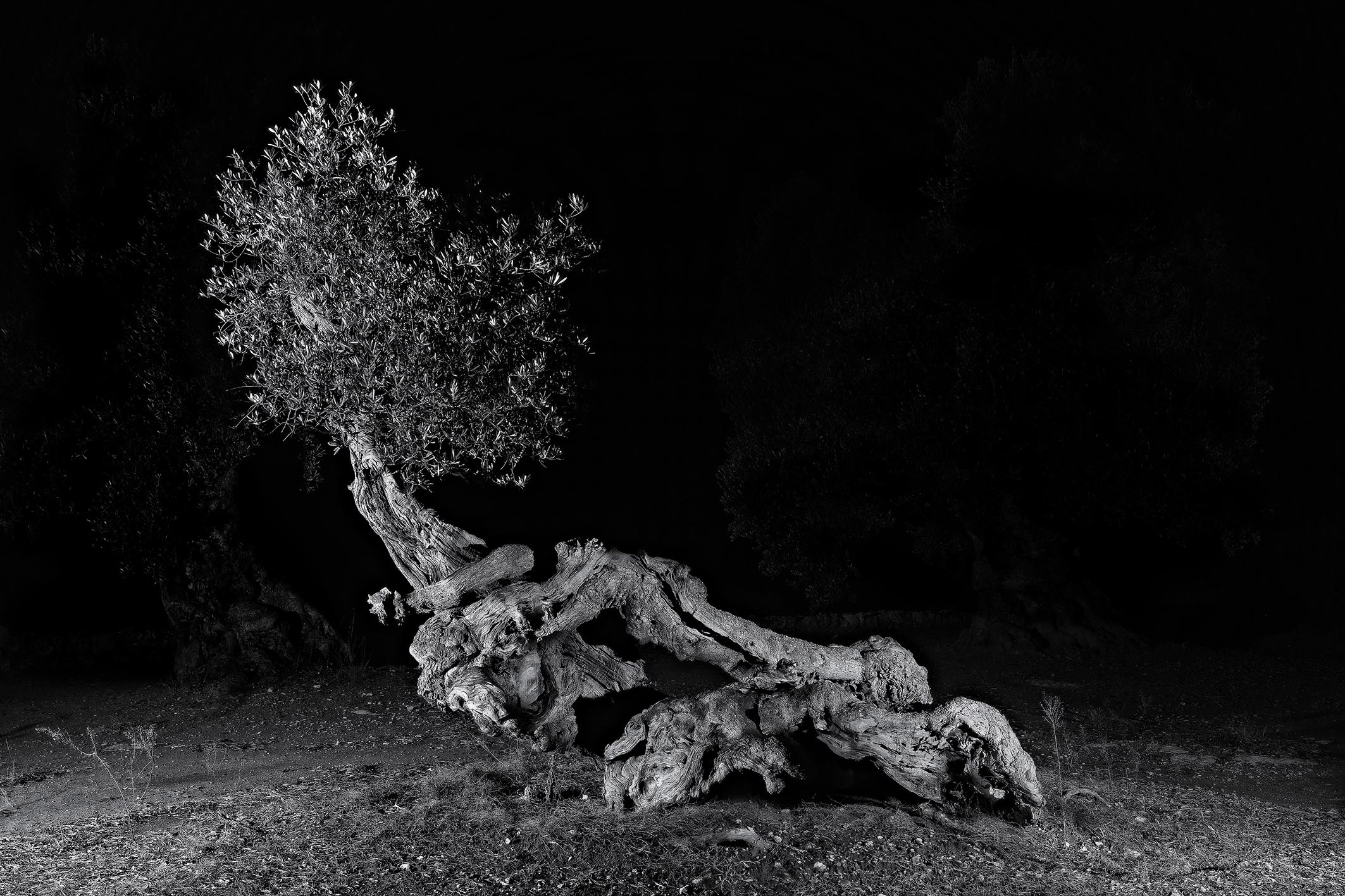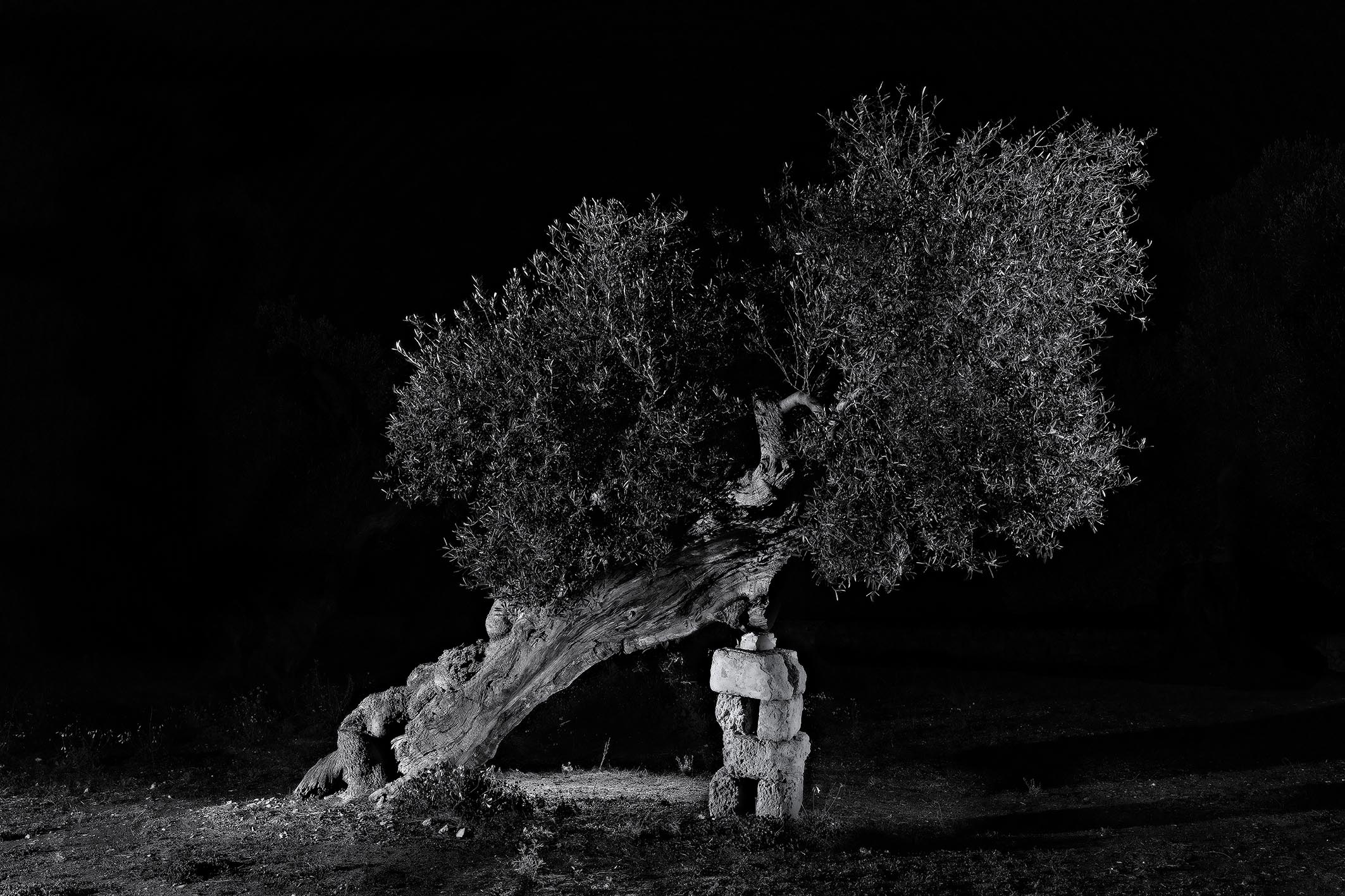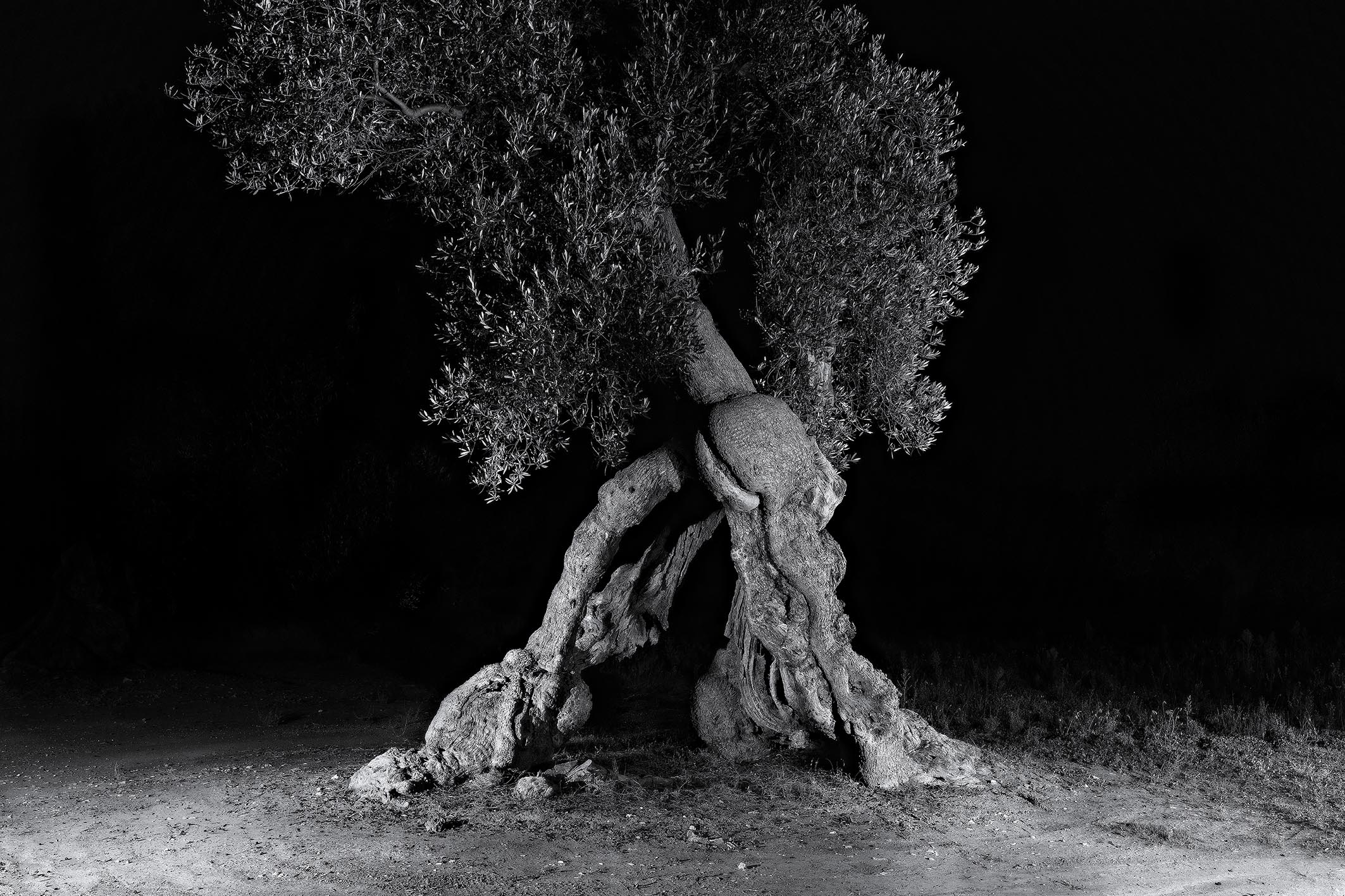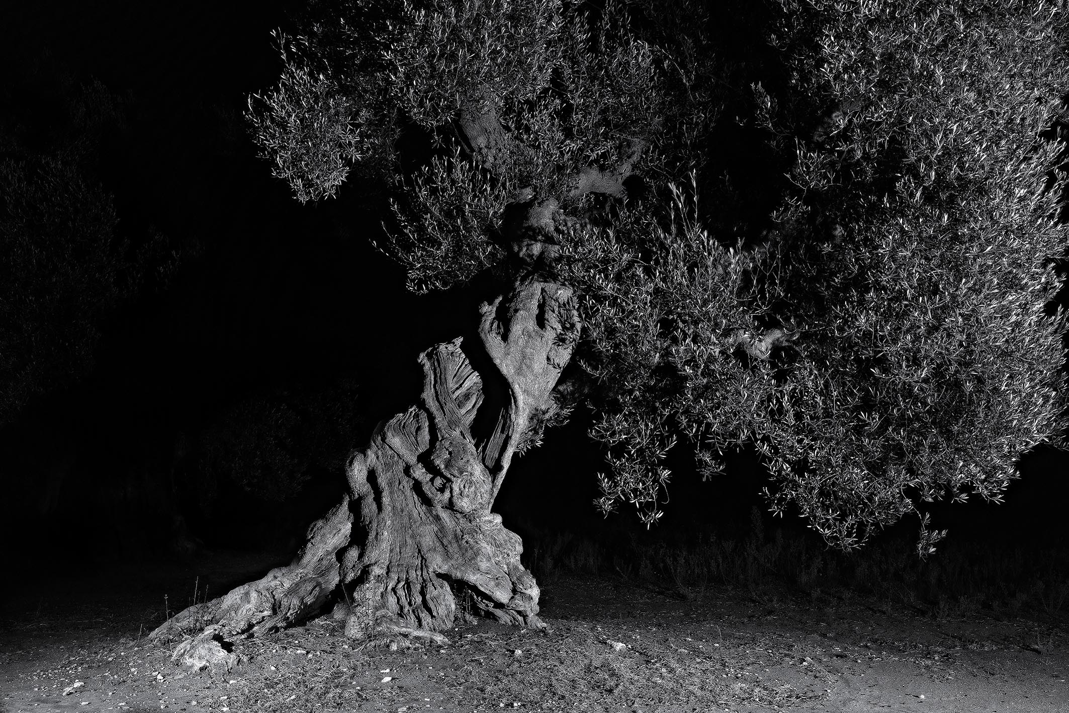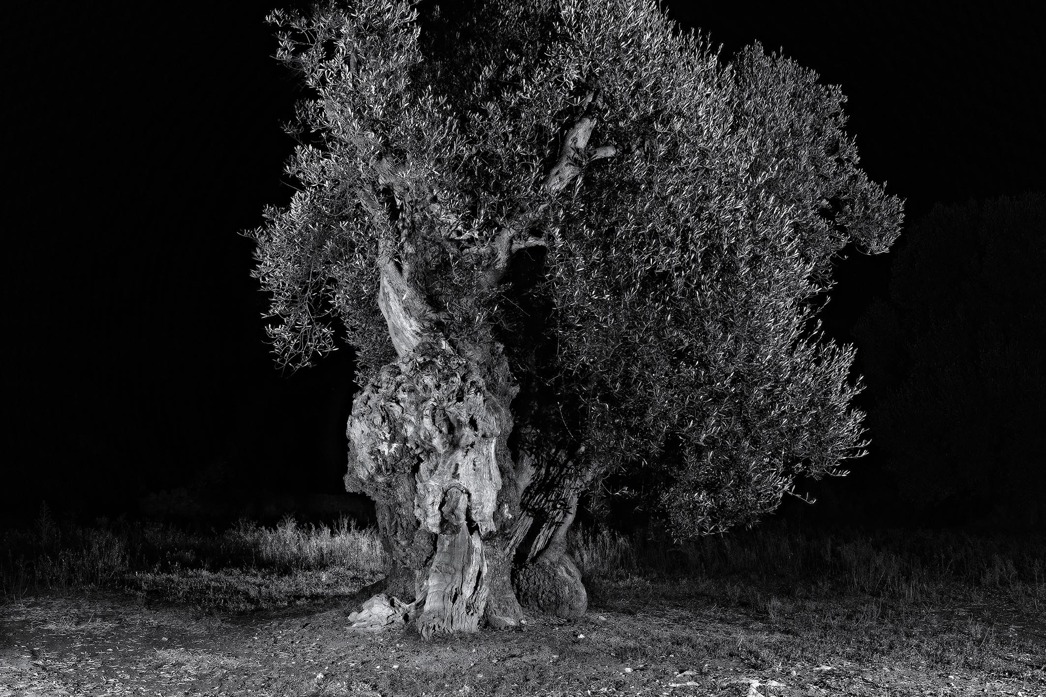 Altri, naturalmente, si sono cimentati nel ritrarre, è il caso di dire, i nostri maestosi ulivi al buio. Alcuni hanno usato la tecnica del light painting, che consiste nel tenere aperto l’otturatore della fotocamera per svariati minuti e nel frattempo pennellare il soggetto, con il fascio di una luce continua, con un effetto pittorico, appunto. Altri hanno illuminato questi soggetti con più punti luce, una luce avvolgente, ottenendo un’illuminazione con ombre attenuate. Io realizzo queste fotografie montando in post produzione diversi scatti ottenuti con un solo punto luce, ma direzionato da punti sempre diversi, ottenendo ombre in diverse direzioni e molto accentuate. Una situazione che dal vivo, nella realtà, non è possibile osservare… e il cervello percepisce questa situazione insolita per i nostri occhi, dando, almeno a me, una sensazione di fantasmaticità.